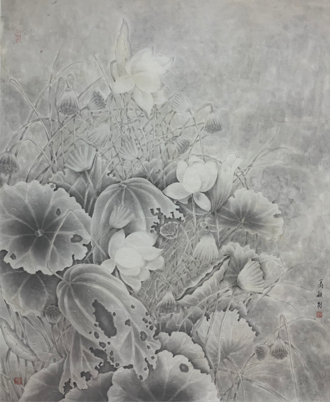 本次展览以“自强不息”为核心主题,聚焦残疾人体育事业中展现的顽强拼搏、积极向上的精神品质,旨在通过艺术创作诠释残疾人运动员的生命张力与精神风貌。葛颖创作的《荷韵抚风》以水墨工笔荷花为主题,通过荷花的清雅意象,隐喻坚韧不屈的生命姿态,与展览“自强不息”的精神内核高度契合,既体现了传统国画的笔墨意蕴,也传递出对生命韧性的赞颂。