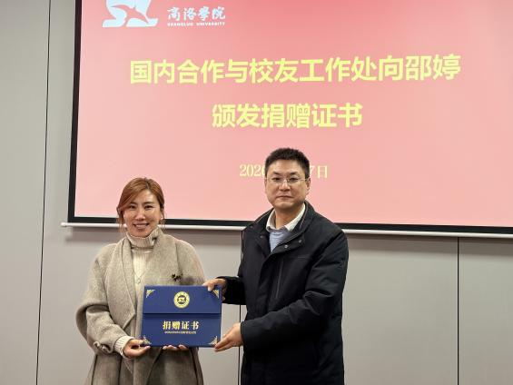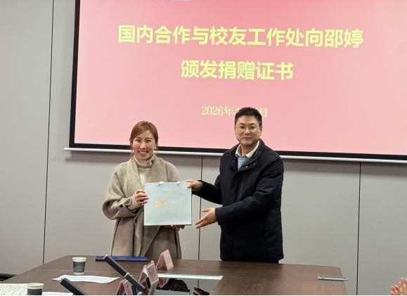 随后,会议举行了简朴而庄重的捐赠证书颁发仪式。为回馈母校培育之恩,支持学院教育事业发展,邵婷校友慷慨向学校捐赠。国内合作与校友工作处副处长张文代表学校向其颁发了捐赠证书,并对邵婷校友的善举表示高度赞赏和诚挚谢意。